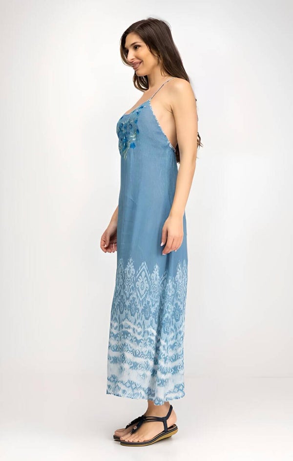 This long dress in a beautiful shade of blue tie dye is perfect to accompany you on every summer adventure. Its light and feminine design makes it ideal for:
